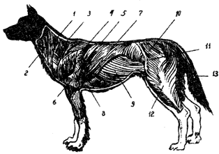 Мускульный кожух туловища состоит из мышц шеи, плечевого пояса, грудной и брюшной стенки, наружных (дорсальных) и внутренних (вентральных) мышц позвоночного столба, мышц конечностей (рис. 5.4.). Эти мышцы обеспечивают важные показатели экстерьера собаки — ширину и выход шеи, выраженность холки, массивность грудной клетки и ее рельеф, прочность спины и т.д. Недостаточное развитие этих мышц может не только портить экстерьер собаки, но и снижать ее работоспособность. Причинами дефектов мускульного покрова шеи и корпуса собаки могут быть недостаточная тренированность животного, неправильное кормление, нарушение нервно-эндокринной регуляции развития мышц и мышечного сокращения. Тренировки и кормление, необходимые для правильного развития мускулатуры собаки, достаточно описаны в кинологической и общей литературе. Остановимся на корригирующих воздействиях, необходимых для нормализации проводимости возбуждения в мышце, компенсирующих дефицит тренировки и усиливающих наращивание мышечной массы.