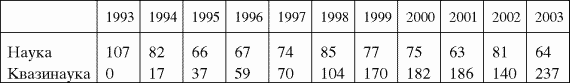 Таблица 2 и рис. 2 свидетельствуют о значительном увеличении числа квазинаучных докторских диссертаций по педагогике в 1993–2003 гг., в то время как число научных докторских диссертаций изменялось незначительно, причем в основном в сторону уменьшения. До 1997 г. научные диссертации еще преобладали над квазинаучными, в 1997 г. их стало почти поровну, а в 2003 г. уже почти 80 % докторских диссертаций по педагогике, если полагаться на аксиомы I–IV, были квазинаучными.