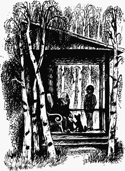 Смотрю — мы очутились во дворе. Большой двор, и скамейки стоят, как в парке. И круглые клумбы. Они красными кирпичиками выложены, чтобы не помять цветы. И между ними домик стоит. Зелёный. С террасой. На террасе сидит беленький старичок и щурится от солнца. Путька подбежал к старичку и с ним здоровается. Он ему лапу протянул, в белой тапочке.