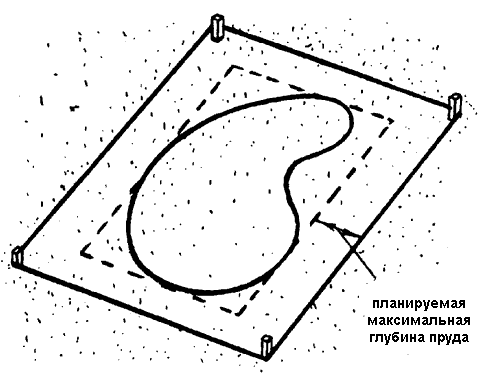 1. Разметьте границы водоема. При обозначении контуров планируемого пруда используйте шнур. Размеры покрытия просчитывайте с учетом глубины водоема (рис. 1).
