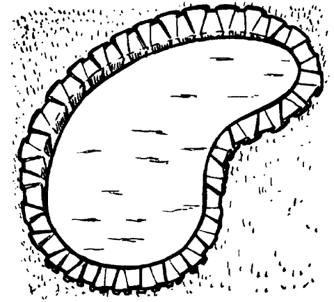 По окружности водоема выложите природный камень или плитку таким образом, чтобы они слегка нависали над водой, примерно на 5 см (рис. 4). Камни можно закрепить при помощи известкового раствора или другого средства. В этом случае они будут держаться более прочно. Эта процедура достаточно трудоемка, так как нельзя допускать попадания извести в пруд, иначе воду придется менять. Оставшиеся неприкрытыми камнем или плиткой участки земли можно засыпать галькой.