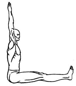 Выполнить мягкую Мула-бандху. Поднимая руки перед собой, с выдохом медленно сесть (между направленными вертикально верх ступнями — расстояние, равное одной длине ступни) (рис.2-29.2). С медленным вдохом вытянуть руки верх ладонями вперед, вытянуть также позвоночник, расправить грудную клетку, продолжая удерживать мягкую Мула-бандху (рис.2-29.3).