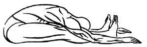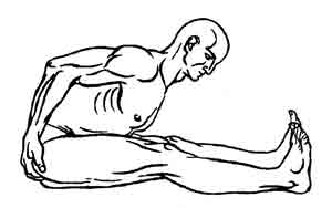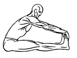 Можно, впрочем, сначала принять самое нижнее положение со слегка согнутыми ногами, а потом полностью выпрямить их, держась руками за ступни и этим движением еще больше растягивая позвоночник. Повторить чередование движений «вытягивающий прогиб — выстилание» еще два-три раза, после чего, полностью выдохнув, расслабить туловище и замереть в самом нижнем положении на 10—20 секунд. Можно использовать захваты различной глубины (см. описание Джану-ширшасаны).