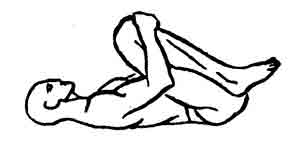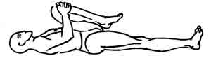 Техника выполнения. Лечь на пол на спину. Выдохнуть. С медленным вдохом потянуться, выпрямив сложенные в замок руки за голову, выполнить легкую Мула-бандху. Выдохнуть. Со вдохом согнуть в колене правую ногу и, не отрывая от пола плоско лежащий таз, сильно прижать руками правое бедро к туловищу (рис.2-30.1). Задержать дыхание в этом положении на 5—10 секунд