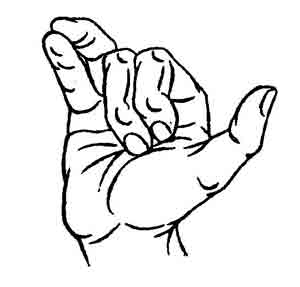 Принять одну из медитативных а, лучше всего—Падмасану. Прижать средний и указательный пальцы правой руки (женщинам—левой руки к ладони. Мизинец и безымяный пальцы сложить вместе, так чтобы площадь поверхности, образованной их подушечками, была равна пощади подушечки большого пальца.