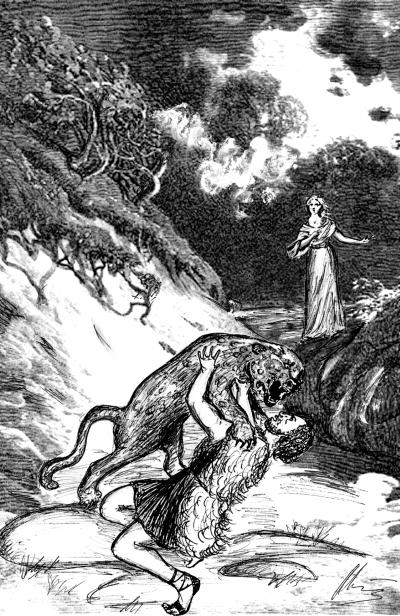 Они едва успели пробежать по тропе сотню локтей, как оглушительный рев позади них и треск кустов доказали отвагу пятнистой кошки. Терсит оттолкнул женщину и заслонил ее собой.