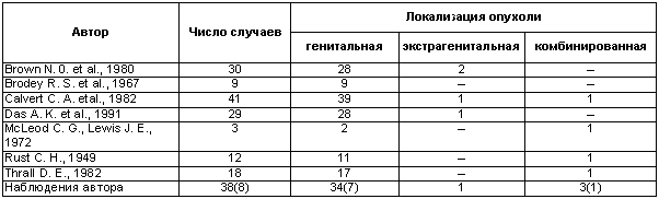 Различают генитальную, экстрагенитальную и комбинированную формы трансмиссивной венерической опухоли. Генитальная форма самая распространенная (табл. 14).