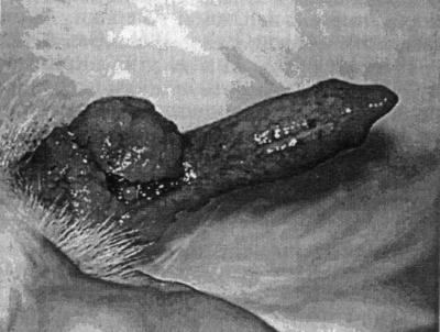 Рис. 18. Обширные вегетации трансмиссивной венерической опухоли на луковице головки полового члена может служить причиной трудных родов и сильных послеродовых кровотечений.