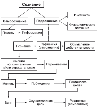 В ходе раскрытия структуры сознания далее необходимо указать на самосознание. Формирование самосознания начинается у человека в раннем детстве, когда он начинает отличать себя от всего другого. В последующем у человека постепенно складывается целостное представление о своем «Я». Самосознание можно охарактеризовать как осознание человеком своих чувств, мыслей, интересов, положения себя в системе отношений с другими людьми и т. д. В самосознании важную роль играет общение с другими людьми, учет их мнений о себе.