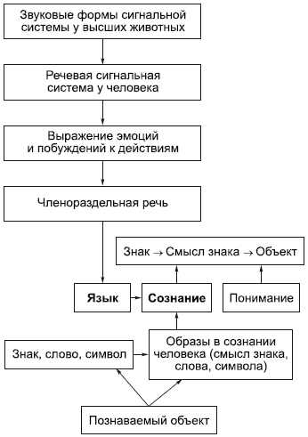 Предпосылками человеческого языка были сложные двигательные и звуковые формы сигнализации, существовавшие у высших животных. В процессе перехода от животных предков к человеку формируется речевая сигнальная система; звуки из средства выражения эмоций и побудителя к действиям становятся средством обозначения вещей, их свойств и отношений, служат для преднамеренного сообщения.