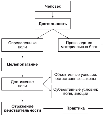 Деятельность – это способ существования человека. Но не все действия, процессы в человеке относятся к деятельности. Человек дышит, ест и т. п. – здесь он ничем не отличается от действий животных. Простуженный человек кашляет, во сне человек храпит и т. п. – эти действия не относятся к философской категории деятельности. Человеческая деятельность отличается своим целенаправленным характером. Деятельность человека, с одной стороны, подчиняется естественным законам, а с другой – определенным целям, которые человек сам себе устанавливает.