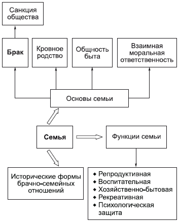 Под браком понимается санкционируемая и регулируемая обществом форма отношений между мужчиной и женщиной, устанавливающая их права и обязанности по отношению друг к другу и детям. Семья – основанная на браке или кровном родстве малая группа, члены которой связаны общностью быта, взаимной моральной ответственностью и взаимопомощью. Юридической основой семьи является оформление брачных отношений между мужчиной и женщиной в соответствии с существующими в обществе законами. Морально-религиозная основа семьи опирается на авторитет церкви.