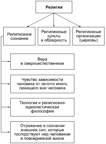 Одна из древнейших форм общественного сознания – религия. Религия и философия образуют мировоззренческую основу общества, что и определяет их важную роль в жизни общества. Содержание религии как социального явления включает в себя три элемента: религиозное сознание (религиозные чувства, представления, идеи); религиозные культы и религиозная обрядность; религиозные организации (церковь).
