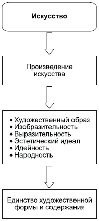 К искусству относятся эстетическое сознание и те явления общественной жизни, которые переживаются как эстетические ценности. К последним относятся и продукты материального производства (которые воспринимаются с эстетической оценкой; особый случай здесь – произведения декоративно-прикладного искусства, дизайн), и явления природы, и сам человек (оцениваемый с позиции красоты), и собственно искусство как совокупность художественных произведений.