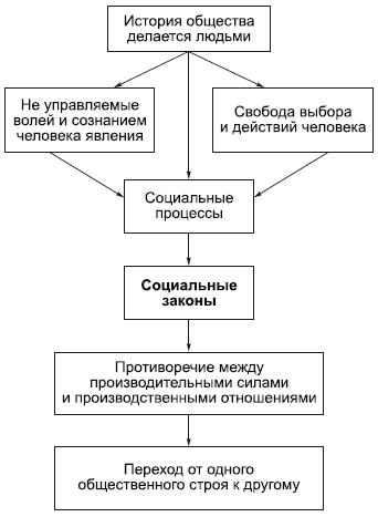 В результате процесс общественного развития совершается закономерно и сознательная деятельность людей в конечном счете является необходимым элементом этого закономерного процесса. Люди сами творят свою историю, но творят ее в соответствии с возможностями, определяемыми объективными, не зависящими от воли и сознания людей, законами.