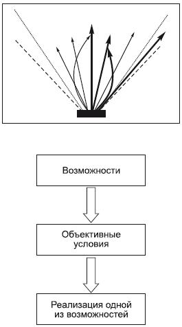 Стрелки на рисунке – это «веер возможностей». Пунктирными линиями изображены его границы, двойным пунктиром – границы, раздвинутые историческим творчеством. Жирные стрелки означают наиболее вероятные возможности. Но реализоваться может любая возможность в границах заданного веера. Это опять-таки означает, что законы истории, как уже отмечалось, не имеют той однозначности, необходимости, неотвратимости, которая присуща законам природы. Зависимость результатов действия законов истории от сознания и воли действующих лиц приводит к тому, что эти законы намечают лишь общую тенденцию к развитию социальных процессов в некотором направлении или, можно сказать, «угол разброса» векторов общественного развития (имеющий к тому же изменяющийся раствор). Предвидеть будущее, опираясь на эти законы, можно только в некоторых общих чертах, но не в конкретных деталях. Имея в виду указанную особенность законов истории, их называют «законами-тенденциями» – в отличие от законов, позволяющих точно рассчитывать, что произойдет при тех или иных заданных условиях.