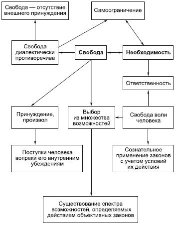 Не существует абсолютной, ни от чего не зависящей свободы. Все поступки человека, даже на первый взгляд необъяснимые, обусловлены внутренним миром человека или внешними обстоятельствами. Свобода воли выражается не в воображаемой независимости от объективных законов и условий общественного бытия, а в том, чтобы сознательно применять объективные законы, с учетом условий их действия.