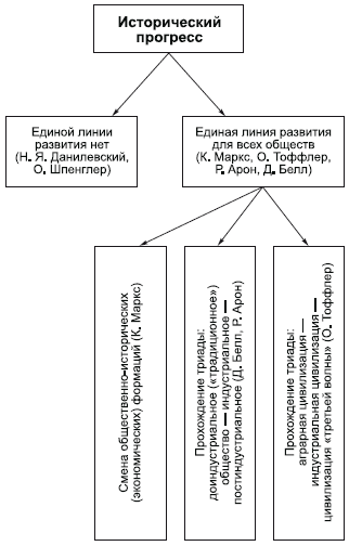 По другой точке зрения все общества проходят одну магистральную линию развития. Эта линия трактуется или как смена общественно-исторических (экономических) формаций (Маркс), или как прохождение триады: до-индустриальное («традиционное») общество – индустриальное – постиндустриальное (Д. Белл); или триада: аграрная цивилизация – индустриальная цивилизация – цивилизация «третьей волны» (О. Тоффлер). Последняя должна быть экологической, демократической и опираться на «мягкие технологии».