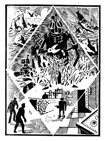 Делая мне знаки, чтобы я не шевелился, Костя приподнял голову над срезом причала. Лицо его выразило такое удивление, что и я поднял голову и удивился не меньше моего друга. На опушке метрах в двадцати от нас возвышалась громоздкая фигура робота. Он был неуклюж, и, видно, его изготовили еще в те времена, когда на внешнюю форму машин такого рода не обращали достаточно внимания, а возможно, что своим создателям он казался образцом элегантности. Но сейчас поражала громоздкость всей конструкции. Тяжелый торс, лишенный ног, передвигался на тележке с гусеничным ходом, по бокам и на спине робота вздувались цилиндрические баллоны. У него не было глаз, а только спереди и с боков круглые черные мембраны (как выяснилось позже, такая же мембрана находилась у него и на затылке). У робота было четыре руки: две длинные, безжизненно свисали почти до земли, две покороче держали блестящие брандспойты; один из них не действовал, из второго била в небо голубая струя морской воды. Некогда довольно нарядное покрытие из разноцветной эмали потрескалось на туловище и руках, эмаль местами отвалилась, обнажив ржавое железо.