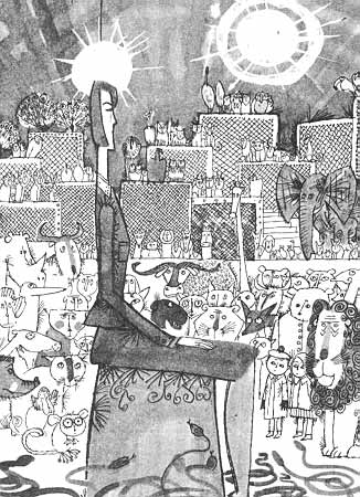 Джейн обращалась к Майклу, но, обернувшись, обнаружила, что его нет рядом. Он незаметно свернул на боковую дорожку. Когда она догнала его, он разговаривал с каким-то Пингвином, у которого под одним крылом была зажата огромная тетрадь, а под другим — огромный карандаш. Пингвин стоял посреди дорожки и задумчиво грыз конец карандаша.