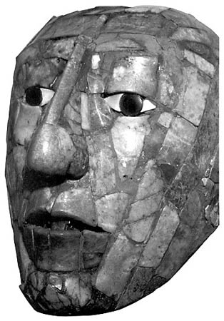 На плоской поверхности плиты ученый обнаружил символическую сцену, вырезанную резцом древнего мастера. В нижней части этой резьбы можно видеть страшную маску, своим видом напоминающую о разрушении и смерти: лишенные тканей и мышц челюсти и нос, большие клыки, огромные пустые глазницы. У большинства индейских народов доколумбовой Мексики это божество выступало страшным чудовищем, питающимся живыми существами. Поскольку все живое, умирая, возвращается в землю, страшная маска представляла собой стилизованное изображение божества земли. Голову его увенчивали четыре предмета, два из которых у майя являются символами смерти (раковина и знак, напоминающий %); два другие, наоборот, ассоциируются с рождением и жизнью (зерно маиса и цветок, или маисовый початок).