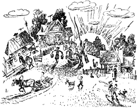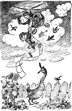 Но вот я мчусь обратно.Вдруг слышу — в переулкеКак будто кто-то плачетИ что-то там не так…А там, внизу, соседку,Бубенчикову Светку,Преследует огромныйРассерженный гусак!Я мигом жму на тормозИ лесенку бросаю,Кричу:— Держись, Бубенчик!И Светку вертолётНа воздух подымает,Несёт и опускаетУ Светкиного дома,У Светкиных ворот. И жмёт мне Светка руку,И гладит вертолётик,И говорит:— За помощьЯ вас благодарю!Я вам обоим завтра,А может, послезавтра,Но всё же обязательноБукетик подарю!4