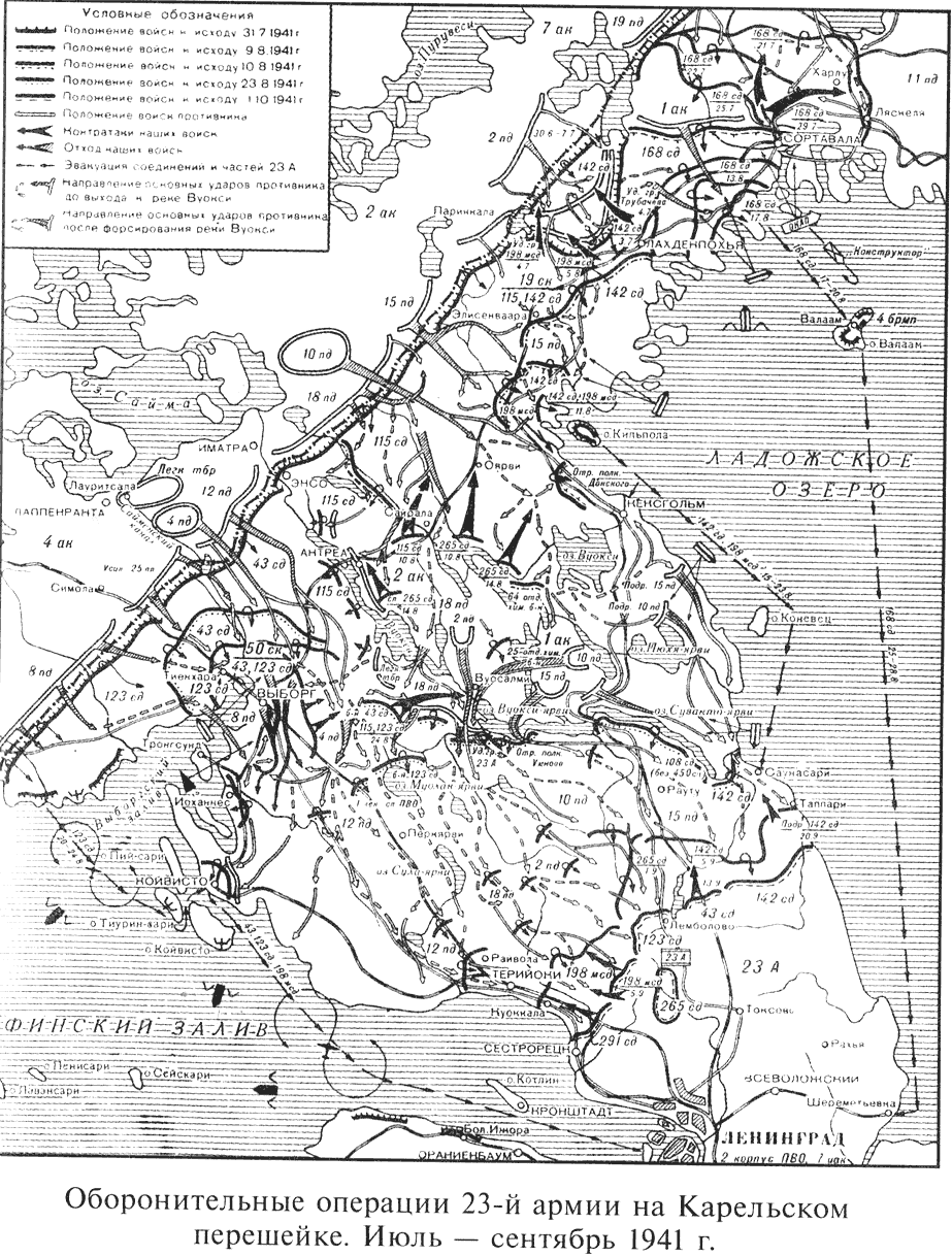 Наиболее опасным с оперативной точки зрения было положение войск правого фланга оборонявшей Карельский перешеек 23-й армии генерал-лейтенанта П. С. Пшенникова. С одной стороны, начертание границы 1940 г. обеспечивало локтевую связь между войсками на Карельском перешейке и 7-й отдельной армией, действовавшей между Ладожским и Онежским озёрами. В распоряжении 23-й и 7-й армий была рокада Петрозаводск — Кексгольм, позволявшая маневрировать силами вдоль фронта. С другой стороны, за спиной правофланговых 168-й, 142-й стрелковых и 198-й моторизованной дивизий, объединённых управлением 19-го стрелкового корпуса, было Ладожское озеро. Единственной коммуникацией, связывавшей их с тылом, была дорога, проходившая через Кексгольм по западному берегу Ладожского озера. В таком шатком положении находилась большая часть войск 23-й армии — 12 стрелковых (67% общей численности) и 7 артиллерийских (58%) полков.