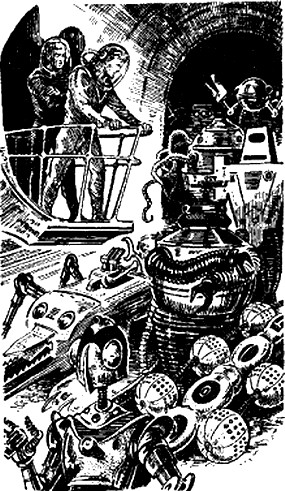 Процессию возглавлял щуплый и большеголовый робот-андроид примерно человеческого роста. Впрочем, он был похож не столько на человека, сколько на кузнечика, вставшего на задние лапки. Это был робот-интеллектуал, командор роботосмены — мощный, подвижный компьютер. А за ним тянулась многоликая, ни на что не похожая, жутковатая в своей своеобразной законченности вереница роботов специального назначения, долговязых, похожих на тощих жирафов, шеи которых украшали по три пары суставчатых рук. Могучие роботы — кроты и тараны, стелившиеся по самой дороге и напоминавшие не то гигантских гусениц, не то многоногих крокодилов. Роботы-титаны с бочкообразным корпусом и мощными клешнями, способными вязать узлами толстые металлические сваи. Стайки разнокалиберных мини-манипуляторов, разительно похожих на черепах. От этого нечеловеческого, неземного многообразия, от этой молчаливой, но целеустремлённой псевдожизни рябило в глазах и было физически больно нервам. Процессия двигалась быстро, но почти бесшумно, семенили лапы и лапки, вышагивали ноги, струились гусеницы. Слышались сухой шорох и мягкий гул, от бронированных тел поднимался лёгкий туман — уже работали системы охлаждения. Лорке почудилось, что такую картину он уже видел и слышал однажды, когда на Ариэле от него разбегалась стая хищных тараканов-гигантов, по которым для острастки ему пришлось полоснуть плазменным лучом. Время от времени манипуляторы роботов приходили в движение: изгибались, складывались и раскладывались, выполняли хватающие, тянущие и толкающие движения.