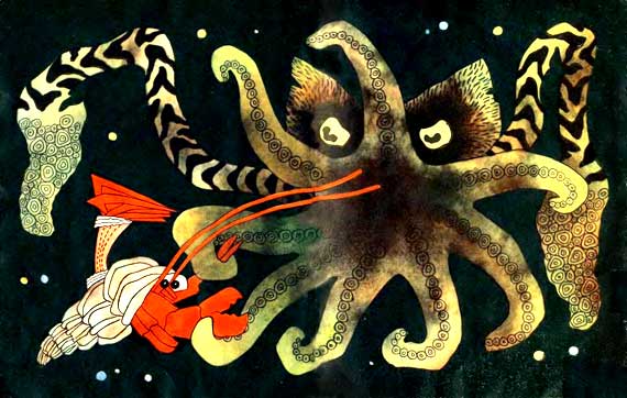 Вот Отшельник уже мог разглядеть страшные присоски на концах её щупалец… Извиваясь, как змеи, щупальца всё приближались и, наконец, схватили бедного Отшельника и со страшной силой потащили его туда, где мерцали огромные немигающие глаза и раскрылся грозный клюв… Отшельник отчаянно сопротивлялся, но щупальца были крепкие, как железо, и его клешни бессильно опустились.