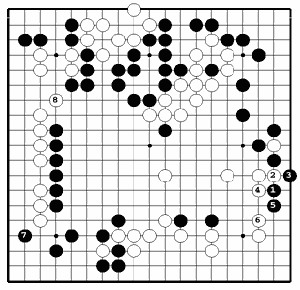 108 ход белых угрожал позиции чёрных в левом верхнем углу доски, поэтому Седьмой дан защитился 109 и 111 ходами, и теперь его группе в том углу гибель не угрожала. Если бы группа попадала под атаку белых до этих ходов, то ей грозила бы гибель или ко-борьба. В этом случае возникла бы очень трудная, богатая разветвленными вариантами позиция, какие бывают в задачах на выживание групп.