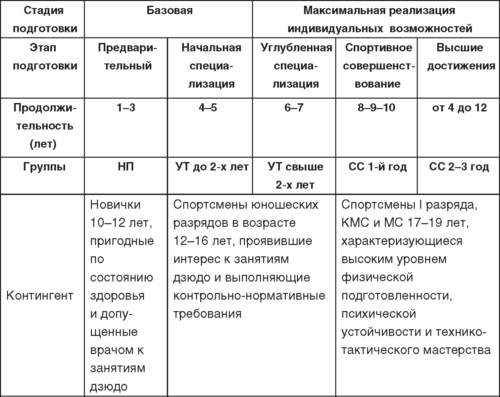 Спортивная подготовка дзюдоистов — многолетний процесс целесообразного использования знаний, средств, методов и условий, позволяющий направленно воздействовать на развитие занимающихся и обеспечивать необходимую степень их готовности к спортивным достижениям (табл. 8).