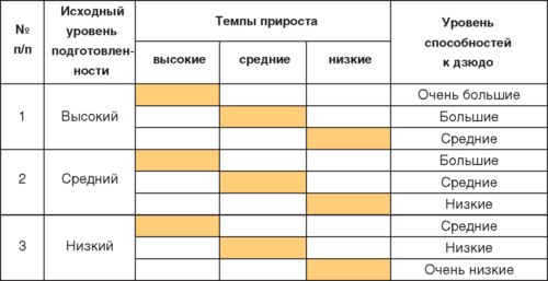 Для определения дзюдоистов, потенциально способных к высоким спортивным достижениям, важен не исходный уровень подготовленности, а темпы ее прироста (табл. 9).