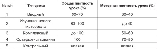 Тренер-преподаватель должен учитывать, что тип спортивно-тренировочного урока влияет на показатели общей и моторной плотности занятия (табл. 11).