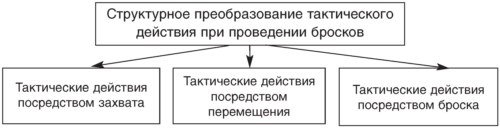 Техническую сторону тактического действия возможно преобразовать структурно, с учетом внесения изменений в детали действия. Преобразование направлено на изменение характера захвата, направление перемещения, способа выполнения предварительного броска, способствующих созданию благоприятной ситуации для проведения основного броска (рис. 11).