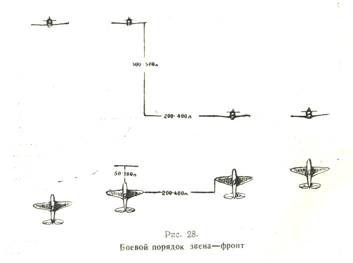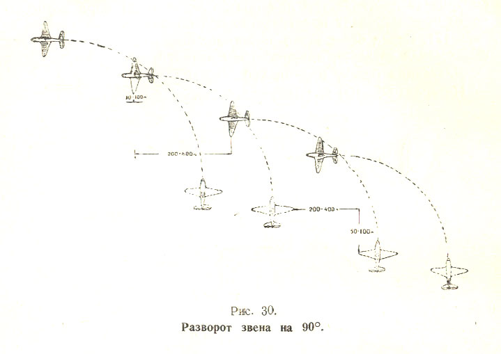 § 172. Боевые порядки звена дают возможность свободно маневрировать в вертикальной и горизонтальной плоскости. Звено может изменять направление на 90 и 180° в минимальное время, равное развороту одиночного самолета.