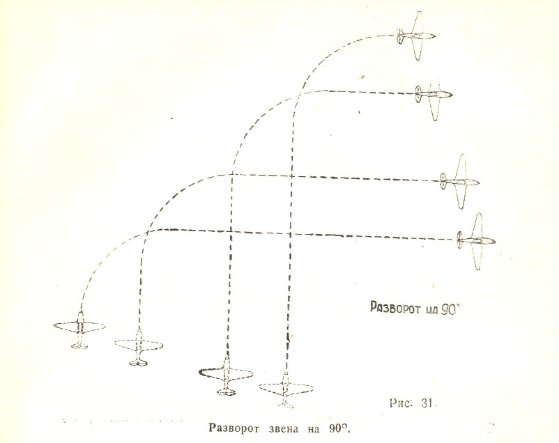 § 174. При отсутствии необходимости выполнения разворота на 90° в минимальное время командир звена производит разворот с несколько уменьшенным креном так, чтобы ведомый и ведомая пара с большим креном и меньшим радиусом приняли боевой порядок после разворота, как показано на рис. № 31.