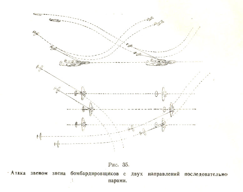 § 182. Одновременная атака звеном по большим группам бомбардировщиков может иметь место при действиях в составе эскадрильи или при отсутствии угрозы со стороны истребителей противника, нанося удар по одному или двум звеньям бомбардировщиков спереди сверху сбоку, как показано на рис. № 36.