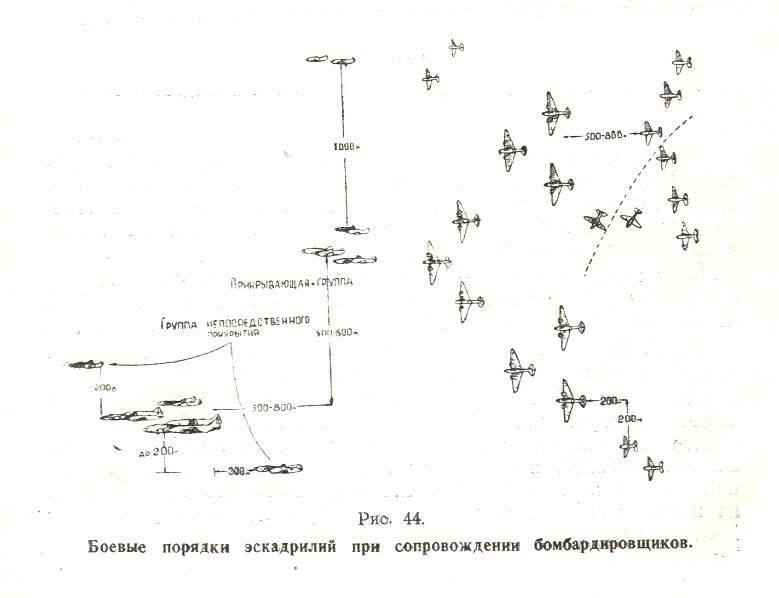 Группу непосредственного прикрытия составляет звено, одна пара во главе с командиром звена идет 200 м впереди и 200 м выше, с интервалом 200 м от флангового, звена бомбардировщиков.