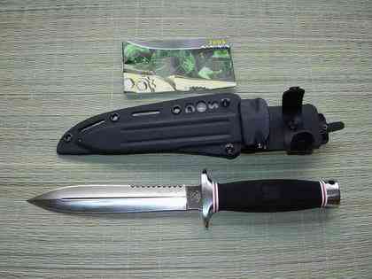 По форме — типичный клиппойнт, напоминающий охотничьи боуи периода 1930 годов, как отмечали разработчики фирмы СОГ. Кстати, они же отметили, что нож создавался для охотников, лесников, экстремалов, а уж потом для спецподразделений. Клинок толстый, 0.16", то есть около 4 мм. в толщину, максимальная ширина — 29 мм. Спуски начинаются примерно с середины клинка. РК остра, нож из коробки бреет. Кстати, это был первый виденный мною "Милитари"-нож, который обладал такими хорошими режущими свойствами. В любом случае 10 кг. мяса на кухне на Новый Год от перерезал без проблем и хуже брить не стал…