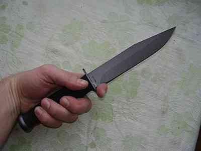 Как я уже писал выше, она без гарды. Больстер не выполняет никакой защитной функции. Рукоять несколько расширяется к больстеру, но, самая главная особенность рукояти — В КРАТОНЕ!!! Этот пластичный приятный на ощупь полимер с рифленой поверхностью обтягивает овальную, со скругленными гранями рукоять и обеспечивает надежное соприкосновение ладони с рукоятью. Нож не скользит даже в намыленной ладони при колющих и режущих ударах. Эту особенность кратона я заметил в свое время уже на ДЕСПЕРАДО. Ну а для проникновения в мягкие ткани тела большого усилия не надо — достаточно удара с силой 40–50 кг, и лезвие, как по маслу, войдет в ткани. Так что, все страхи по поводу соскальзывания руки на клинок при уколе, я считаю, мягко говоря, беспочвенными. В рукояти имеется так же отверстие для темляка.