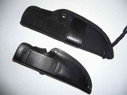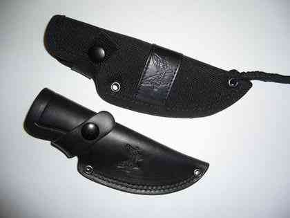 Ножны схожей конструкции с ножнами Bowie, но из других материалов. Ножны Drop Point сделаны из кордуры с пластиковой вставкой— стаканом. Те же неудобства с подвесом. Такая же застежка. Только кордуровый ремешок эластичнее кожаного, и потому заклепка держит надежней — меньше шансов, что она откроется произвольно, или от случайного прикосновения.
