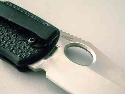 Очень и очень прилично ведет себя сталь 440C, довольно легко точится в бритву и долго сохраняет РК. Нарезание продуктов происходит легко и непринужденно, несмотря на спуски только на половину ширины клинка — в продуктах не вязнет, сказывается относительно тонкая РК и правильная финишная обработка — не прилипает, всегда можно сделать потяг. Пластиковая рукоять покрыта приятными пупырышками, предотвращающими скольжение. Есть отверстие для темляка, но если носить нож на клипсе, оно, по большому счету, не очень-то нужно — клипса позволяет носить нож только клинком вниз, соответственно темляк надо запихивать в карман первым и доставать за него нож невозможно.