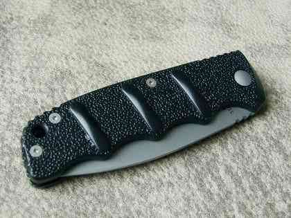 Подпальцевые выемки и выступы на рукояти очень помогают контролировать нож, как в перчатке, так и без нее, хотя выступы правильнее, по-моему, было бы разместить по-другому. Но это дань дизайну оригинального штык-ножа для АК-74, по мотивам которого Дитмар Поль и спроектировал этот фолдер.