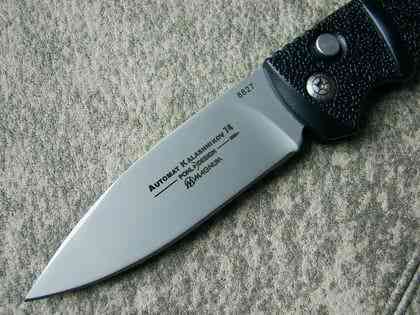 Предохранитель довольно странный: во-первых, он предохраняет только от открывания (на закрывание он будет работать только при полном выходе кнопки, то есть перестанет выбираться люфт клинка); а во-вторых, он свободно болтается, не фиксируясь в крайних положениях. Причем, на новом ноже он тоже не фиксировался, а просто ходил потуже, но быстро разболтался. Объяснить такую конструкцию можно тем, что при ношении ножа клинком вверх на клипсе движок предохранителя под действием силы тяжести сам падает вниз, блокируя кнопку открывания. Однако если носить нож как-либо по-другому, это превращается в геморрой, т. к. нельзя быть уверенным в предохранителе. Открывается нож с несколько "свистящим" или "звенящим" щелчком — звук не очень приятный. Расположение кнопки вполне позволяет закрыть нож одной рукой, хотя и не очень удобно. В резе АК74 проигрывает Пике, несмотря на спуски от обуха и тройной клин. Клинок отпескоструен так, что на ощупь напоминает мелкий наждак, который сопротивляется потягу. Да еще и отмыть клинок проблема, все, что режешь, оставляет не очень-то аккуратные пятна…