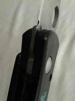 Выявленные минусы — ось клинка закреплена в пластике, что при высоких нагрузках чревато люфтами (практика показала, что я напрасно этого боялся — нож, в общем-то, джентльменский, и мне не приходилось прикладывать к нему каких-либо запредельных усилий, а при обычном использовании материал рукояти ведет себя вполне адекватно). Клипса в положении у головки рукояти закрывает собой винт оси, поэтому для подтягивания и ослабления винта ее приходится снимать. Ребристая насечка на обушке рвет одежду при вытаскивании ножа из кармана, при резком закрывании ножа режущая кромка может удариться о детали, скрепляющие плашки рукояти (это тоже не случалось, расположение стопорных штифтов не позволяет клинку повредить режущую кромку). Клипса рассчитана на узкий ремень, хотя неплохо держится и на широком (Нож я на ремне не ношу, а на кармане или за поясом это роли не играет). Отсутствует отверстие для крепления темляка. Немаловажный минус — не слишком надежное удержание клинка в рукояти в закрытом положении, что вынуждает меня носить нож в положении "острием вниз".