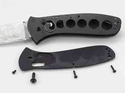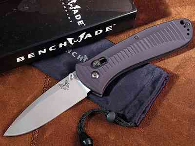 Итак, отдав без малого 7000 руб, я стал обладателем новенького Benchmade 520. Рукоять из анодированного алюминия, надо сказать, загадка. Иногда она кажется просто черной, при дневном освещении вроде с фиолетовым оттенком, а в свете ламп накаливания вроде уже и коричневая: