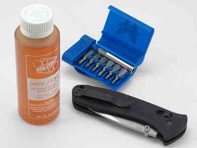Покромсав в очередной раз сыру с ветчиной, обнаружил что внутри набралось прилично мусора. В прорези AXIS Lock набирается что-то типа пыли/волокон от ткани, ну и остатки сыра попали, жидкость от ветчины… Рукоятка слегка в жирных пятнах. Решил помыть капитально. Не мудрствуя лукаво весь нож целиком промыл в воде с пеной Фэйри от поролоновой губки. Всё смылось, нож как новый. Протёр насухо снаружи, а внутри высушил феном. AXIS Lock после этого стал срабатывать "суше", стало понятно что нужна какая-то смазка. Посоветовавшись со знающими людьми, принял решение купить флакон Militec-1 и как следует смазать нож. Чем и занялся в ближайшую субботу (голубая коробочка — известный Blue Box от Бенчмейда, набор фирменных бит для разборки ножей этой фирмы):
