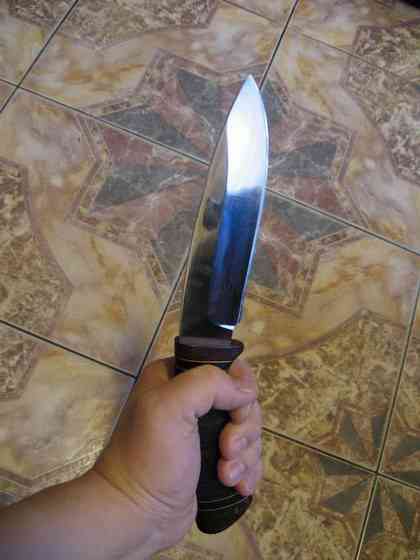 Ещё одна приятная деталь — ухватистая рукоять, рука не устает совершенно, пусть из наборной кожи и впитывает все "приятные" запахи, но как в руке лежит! Опять же, средства для мытья посуды ни кто не отменял.