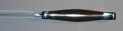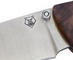 Теперь от дифирамбов к косякам: На голомени клинка остались следы ковки — не есть гуд, выглядит не очень аккуратно. Клеймо мастера и марка стали на обороте сделаны очень плохо, Сергей написал об этом буквально следующее: "худших клейм мне ещё не делали, и ругался я по этому поводу долго. Но исправить уже ничего нельзя было — как мог облагородил.". Если бы не было жалко клейма мастера — сошлифовал бы нахрен, чес-слово.