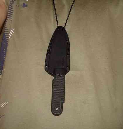 В ножны нож входит плавно и также выходит. Сидит достаточно плотно, однако в ношении данного ножа на шее без дополнительно фиксации в ножнах я не очень уверен. Все равно, прыгнешь, заденешь, заденут, хорошо, если мимо ноги выпадет.